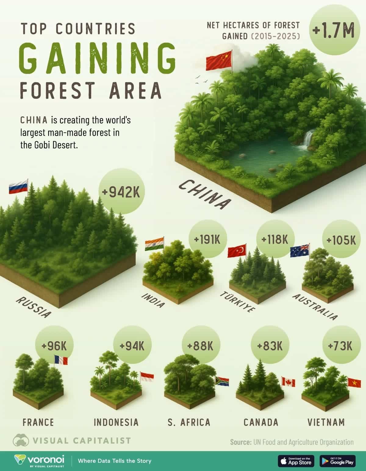 Леса, выполняющие роль «зеленых легких» планеты, поглощают углекислый газ и выделяют кислород. Кроме того, они формируют собственные экосистемы и циклы движения воды, оказывая влияние на территории за тысячи километров. В то время как за последние десятилетия Амазония потеряла миллионы гектар леса, ряд стран активно реализуют программы лесовосстановления.
