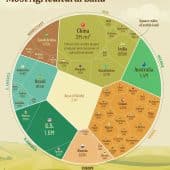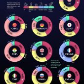 Инфографика сравнивает энергетический баланс 10 крупнейших экономик мира, показывая, какая доля их общего энергопотребления приходится на нефть, природный газ, уголь, атомную энергию, гидроэнергию и другие возобновляемые источники.