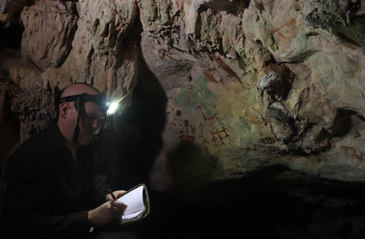 Следы от руки на стене пещеры Лианг Метандуно на острове Муна разглядеть довольно сложно: это малозаметные пятна над более четким коричневым изображением в левой части этого фото. Коричневые изображения на этой стене пещеры оставлены тоже в палеолите, но через примерно 35-45 тысяч лет после того, как был сделан бледный в наши дни исходный рисунок / © Maxime Aubert