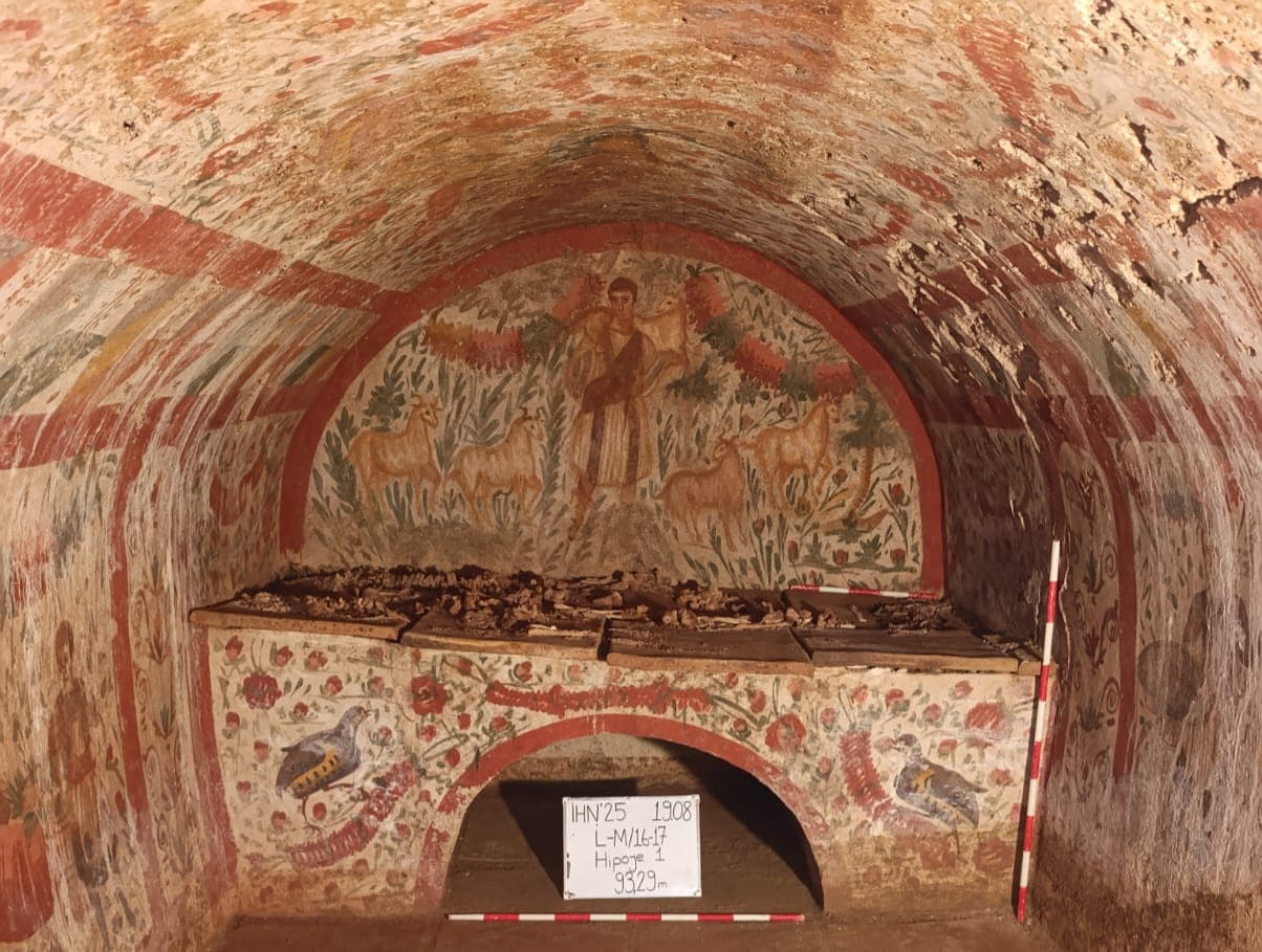 Внутри гробницы расположилось погребальное ложе, на которое укладывали покойных. Ложе, выполненное из квадратных терракотовых плит, находится рядом с той самой уникальной фреской. На ней изображен Иисус в юношеском облике, несущий овцу на плечах. Этот образ встречался на территории современной Италии в первые века христианства, но крайне редок для Малой Азии.