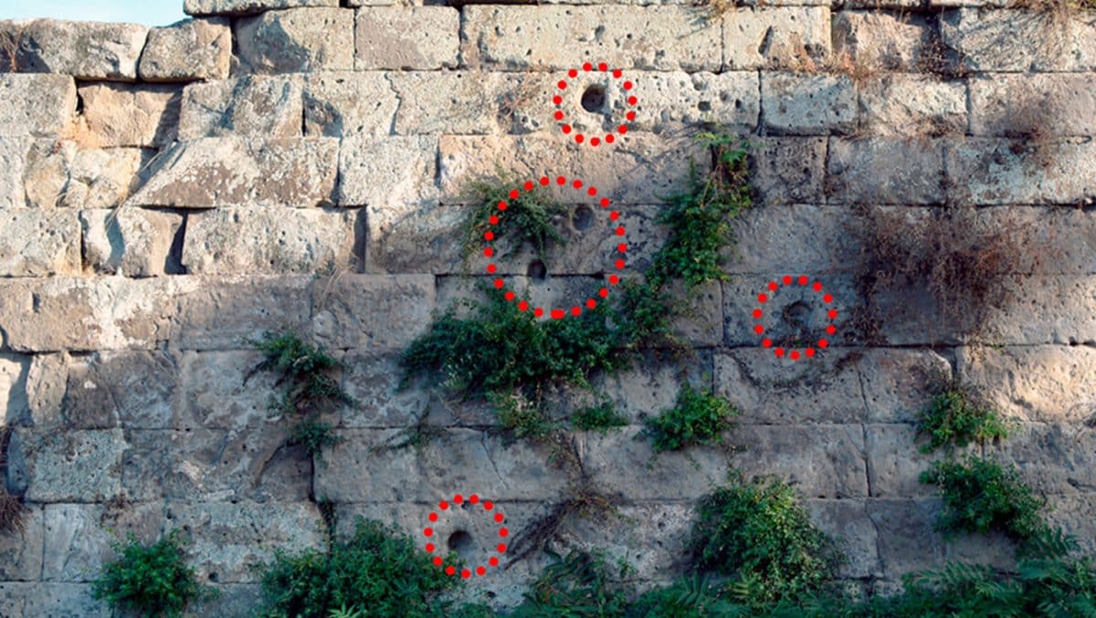 Авторы нового исследования, опубликованного в журнале Heritage, обратили внимание на то, что между вмятин, оставленных на северной стене Помпеев катапультными снарядами, через равные интервалы разбросаны группы расположенных веером, более мелких по размеру, но более глубоких четырехгранных углублений явно антропогенного происхождения.