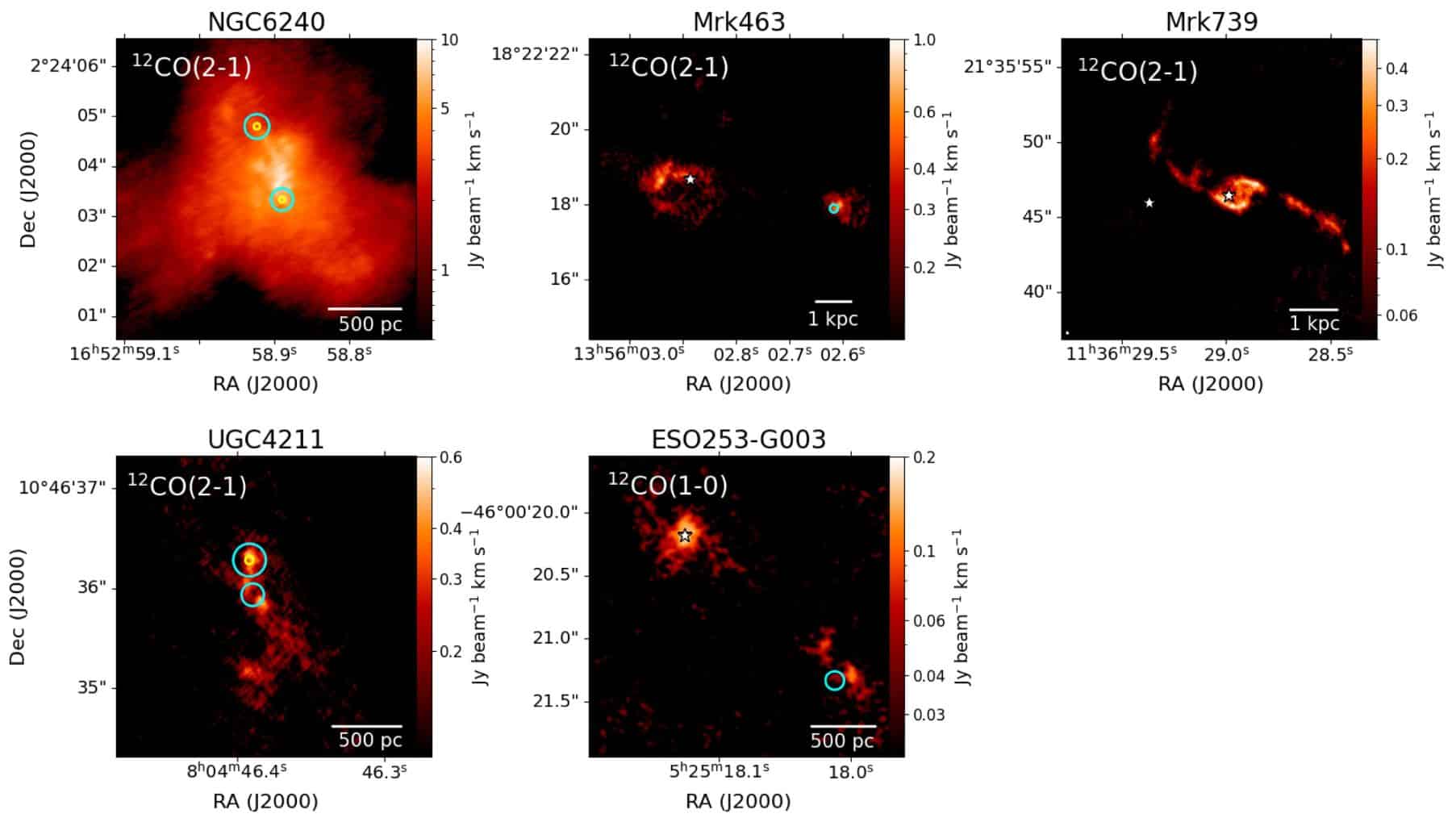 В выборку попали семь слияний массивных галактик: пять с двумя активными ядрами и два с одним активным ядром. Действительно, чем ближе становятся их ядра, тем плотнее скапливается молекулярный газ в центральной области.