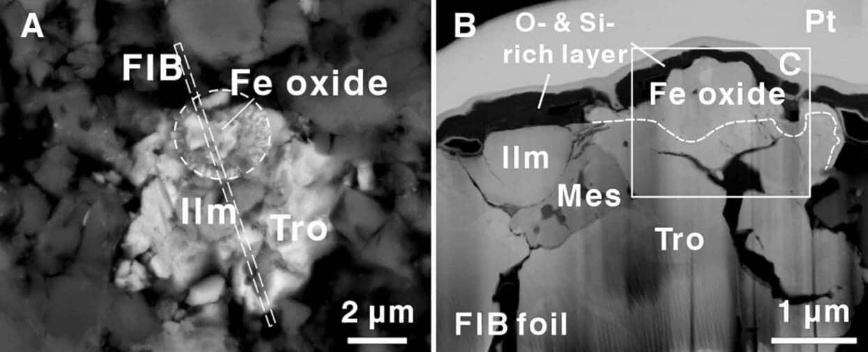 Наконец, полученный срез «просканировали» электронным микроскопом. В результате в нем обнаружили гематит и очень похожий на него по составу маггемит. Примечательно, что их кристаллы там прослеживаются как «наросты» на зернах других минералов. Ученые уверены, что такие конструкции за короткое время в лаборатории сформироваться не могут. Поэтому их вердикт гласит, что наблюдаемые оксиды железа действительно лунные. Это неизбежно приводит к вопросу, как они могли появиться на Луне.