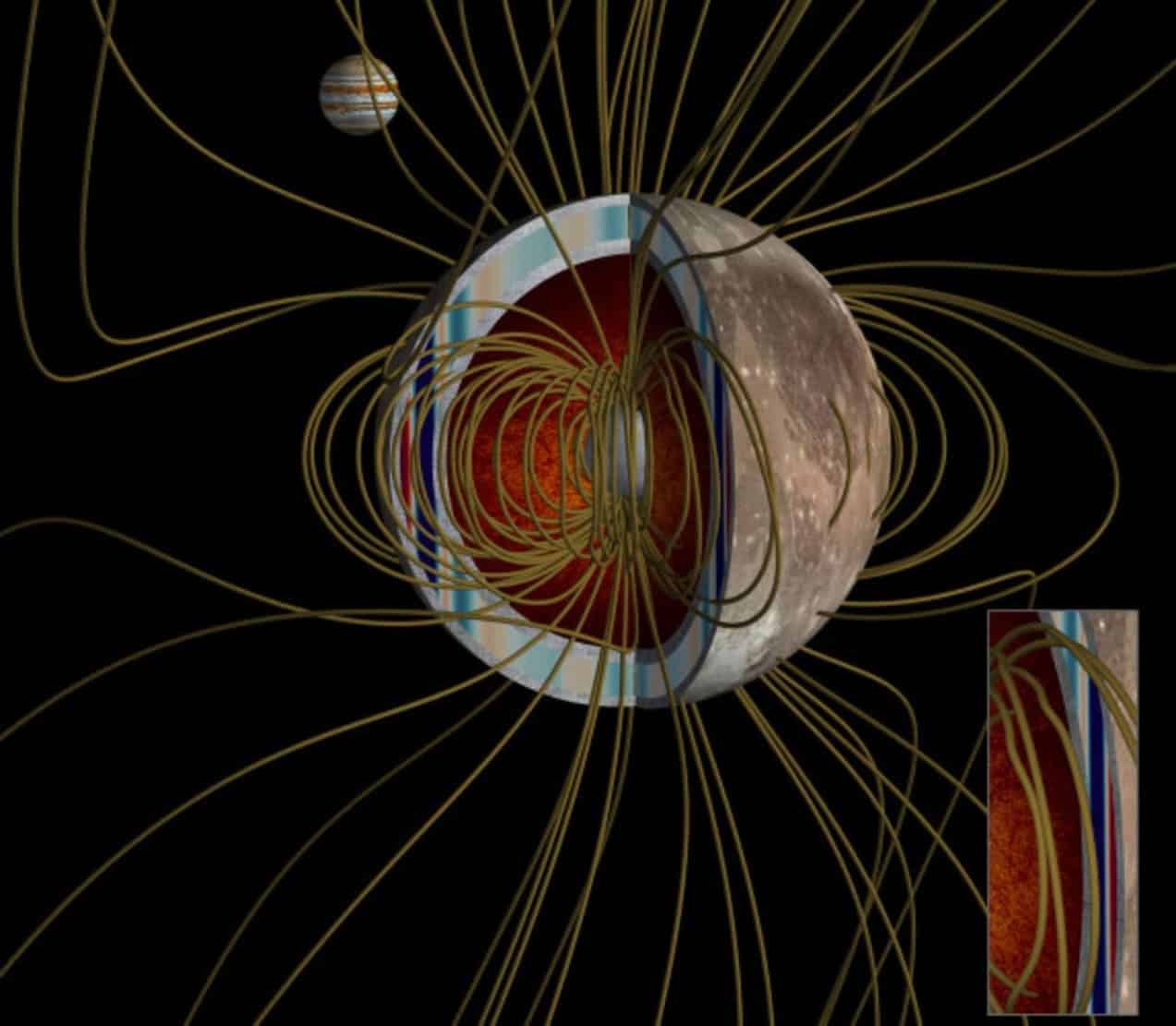 Ганимед вместе с Ио, Европой и Каллисто все время находится внутри нее. При этом напряженность магнитного поля вокруг Юпитера не везде одинаковая. Поэтому в процессе обращения спутников вокруг планеты они движутся в меняющемся магнитном поле, а от этого возникают индуцированные токи в любом веществе небесного тела, которое проводит электричество. Вместе с этим вырабатывается «побочное» индуцированное магнитное поле, заметное на общем «фоне».