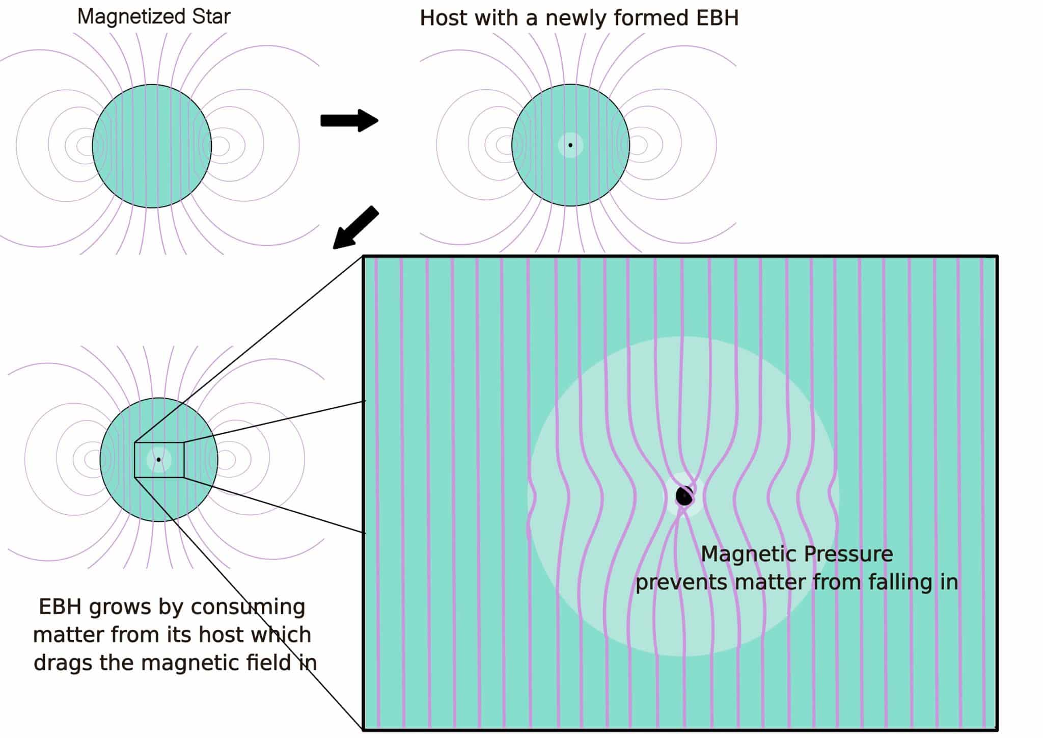 Схема, описывающая как внутри намагниченной компактной звезды из накопившейся темной материи формируется крошечная черная дыра, которая начинает поглощать вещество и затягивать магнитное поле. По мере роста ЧД поле усиливается и искривляется, создавая магнитное давление, тормозящее падение вещества и останавливающее дальнейшее разрушение звезды. / © H. A. Adarsha