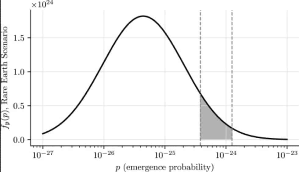 На графике изображена вероятность космического одиночества в рамках гипотезы уникальной Земли: черная кривая отражает распределение вероятности возникновения жизни, а серые пунктирные линии — границы «зоны одиночества». Заштрихованная область показывает пересечение между распределением вероятности и «зоной одиночества» (последняя составила примерно 29,1%). При таких параметрах человечество — единственная развития цивилизация во Вселенной.  / © Acta Astronautica (2025)