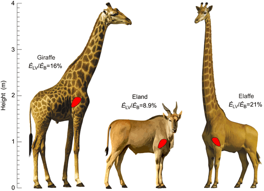 Затраты энергии организма на работу левого желудочка. Слева — жираф, в центре — антилопа канна, справа — химера жирафа и антилопы / © Seymour and Snelling