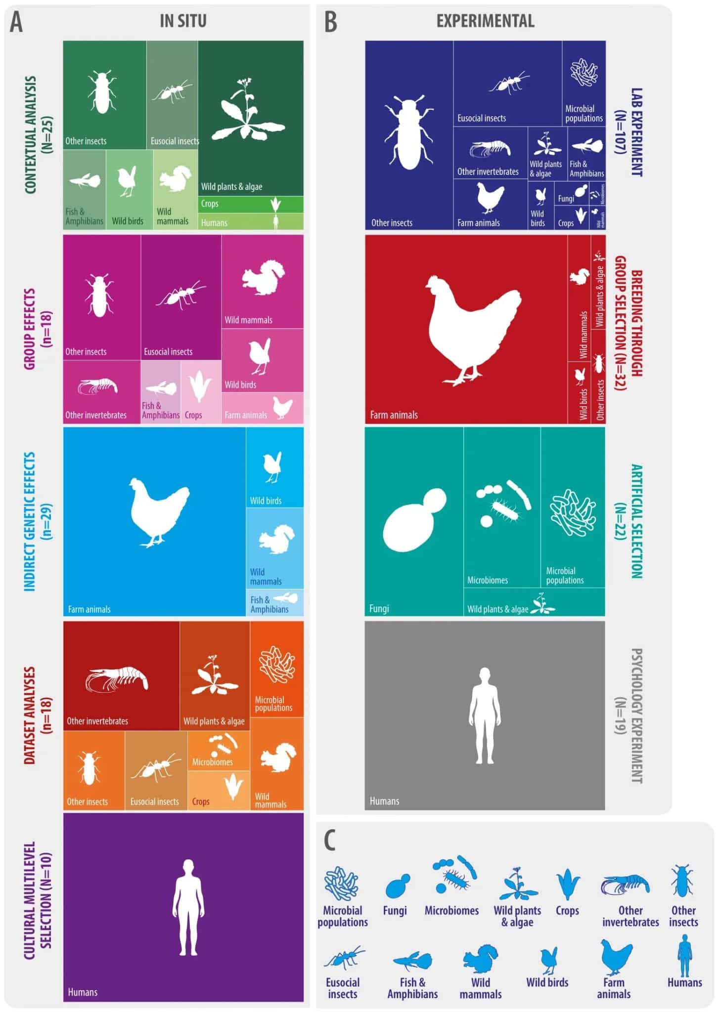 Распределение 280 исследований, подтверждающих эмпирически многоуровневый отбор, по системам и типам исследований: (A) исследования in situ; (B) экспериментальные исследования; (C) системы исследований. / Cesar Marin et al./Frontiers in Ecology and Evolution (2026)