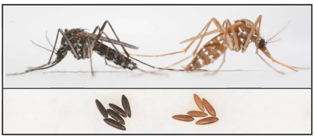 Самки комара Aedes albopictus. Дикий тип (слева) и желтый мутант (справа). Внизу — яйца, отложенные самками / © Doron S. Y. Zaada et al.