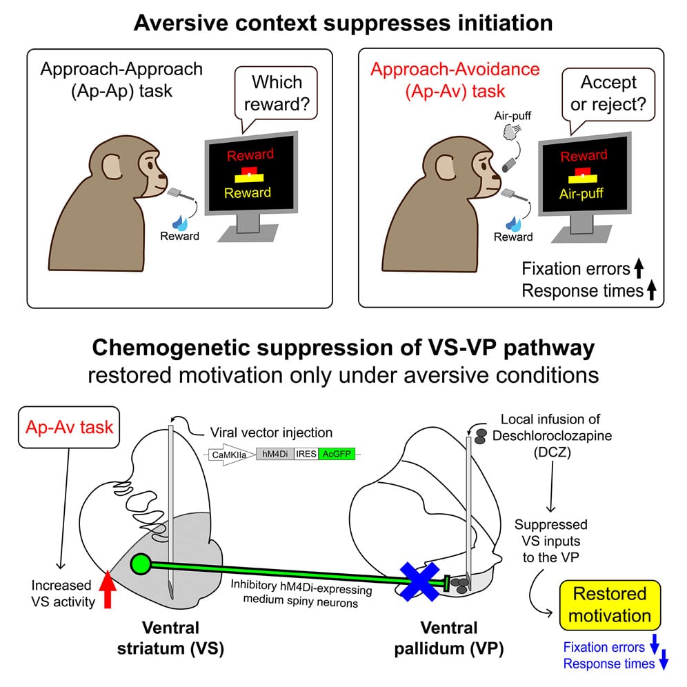 Нейрофизиологи обнаружили механизм, который блокирует начало действий в стрессовых условиях. Временное отключение этого нейронного пути вернуло обезьянам мотивацию выполнять работу даже при наличии отталкивающих факторов.