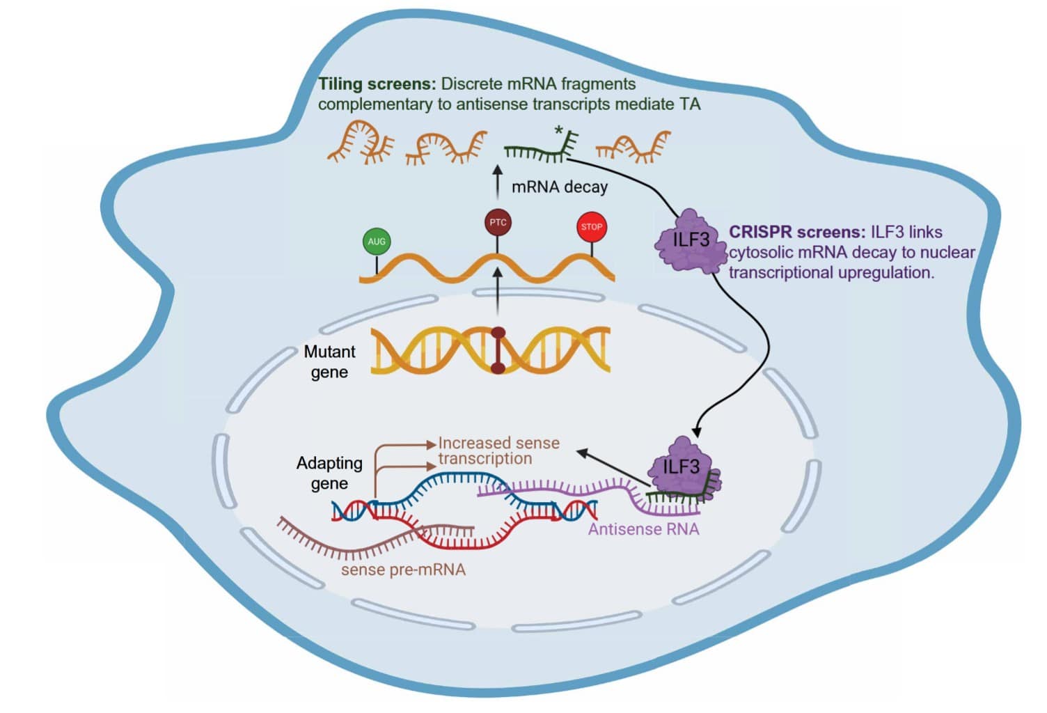 В клетках существуют механизмы, которые исправляют или компенсируют поломки в генах. Один из защитных механизмов называется «транскрипционная адаптация». Работает он так: обнаружив дефектную матричную РНК (мРНК), клетка уничтожает ее, но использует продукты распада как сигнал бедствия. Этот сигнал заставляет активироваться здоровые гены-дублеры (паралоги), которые берут на себя функции сломанного.