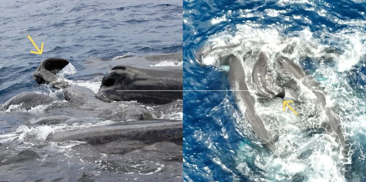 Кашалоты поддерживают на поверхности новорожденного. Желтая стрелка показывает свернутые хвостовые плавники детеныша / © Yaniv Aluma et al., Scientific Reports, 2026