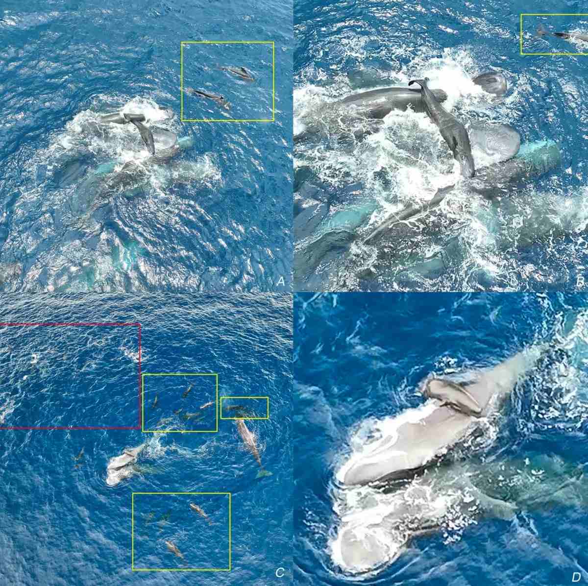 Детеныша держат на поверхности. В желтых прямоугольниках видны короткоплавниковые гринды, которые подплывают вплотную. В красном — дельфины Фрейзера, держащиеся на удалении. / © Yaniv Aluma et al., Scientific Reports, 2026