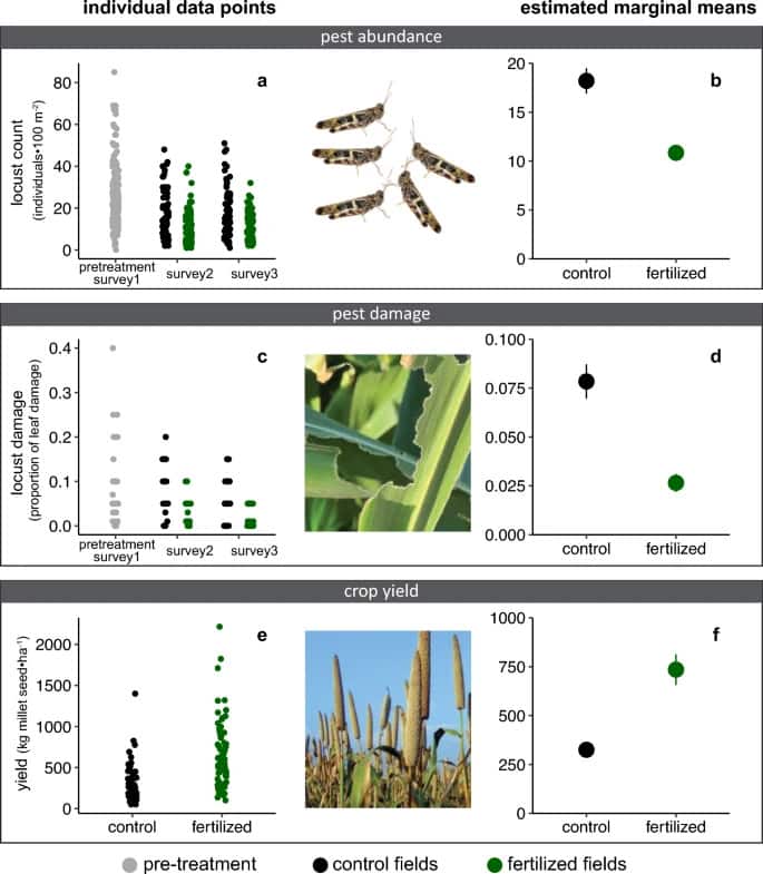 Поля обследовали на предмет численности насекомых и ущерба для урожая трижды: до внесения удобрений, во время него и после. Результаты серьезно разнились на разных полях, поскольку даже в одном регионе предсказать, куда прилетит больше саранчи, а куда меньше, довольно сложно. Тем не менее, в среднем число саранчи на один гектар в обработанных районах упало еще в период вноса удобрений и еще серьезнее сократилось после него (на десятки процентов). Урожайность проса на обработанных участках тоже выросла на десятки процентов. Но довольно сложно сказать, было ли это эффектом защиты от саранчи или же внесения удобрений.