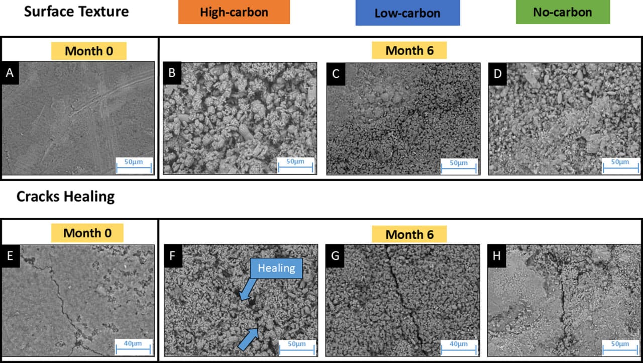 По результатам эксперимента ученые заключили, что эффективность процесса самозалечивания зависит от количества органического материала, доступного бактериям. В системах с высоким содержанием углерода бактерии проявили высокую активность, произвели большое количество диоксида углерода, который снижал pH окружающей воды и способствовал образованию множества кристаллов кальцита. Это запечатало трещины и уменьшило пористость цемента. Также исследователи узнали, что при определенной концентрации органики может стать недостаточно для самозалечивания цемента.