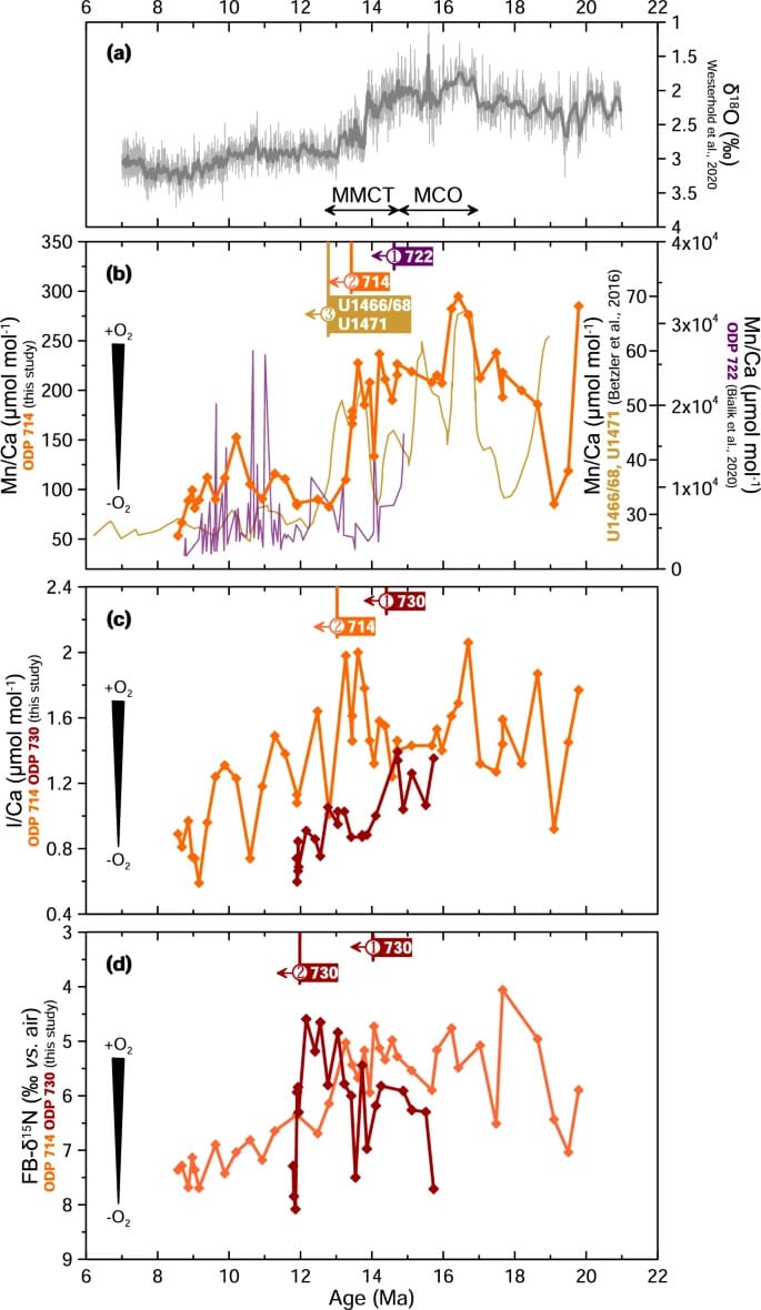 Пока миоцен оставался на пике своей теплоты, Аравийское море, как и древний Тихий океан, имели больше кислорода, чем сегодня. Лишь около 12,1 миллиона лет назад, когда климат стал значительно холоднее, содержание кислорода начало уменьшаться. При этом дефицит кислорода в Аравийском море после похолодания стал острее, чем в Тихом океане.