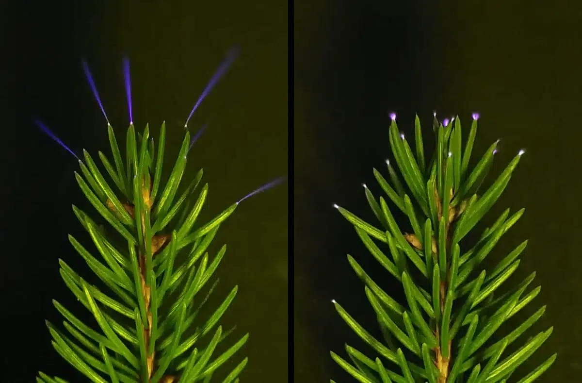 Коронные разряды на ели, вызванные заряженными металлическими пластинами в лабораторных условиях / © William Brune / StudyFinds