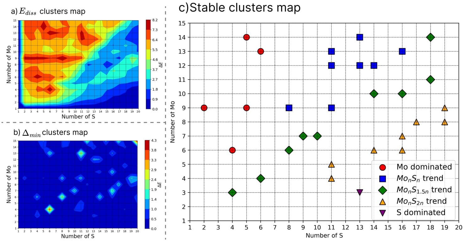 Физики оценили стабильность кластеров по двум критериям: минимальной энергии (∆min), необходимой для «перестройки» кластера при добавлении или убавлении в него атома молибдена или серы и энергии диссоциации (Ediss), необходимой, чтобы кластер распался. Кластеры, соответствующие обоим критериям, называются магическими. Они обладают оптимальной геометрической формой и распределением электронов внутри, за счет чего становятся значительно стабильнее чуть меньших или чуть больших соседей.