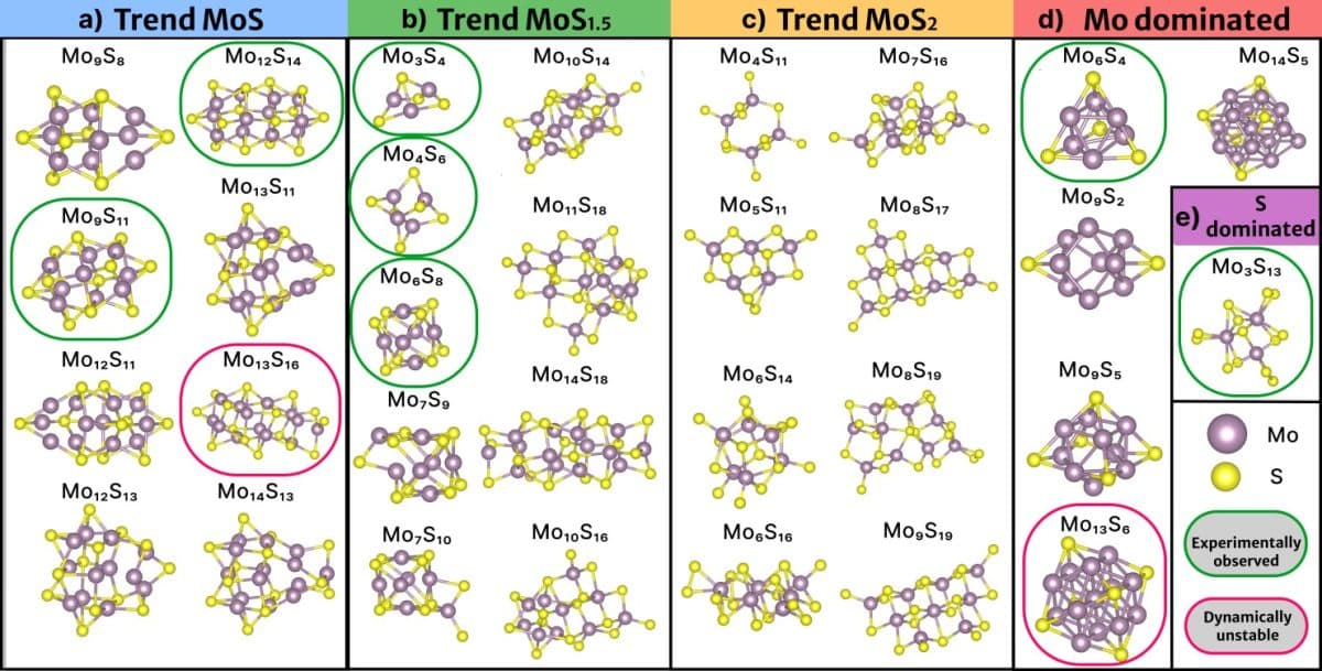 Ученые разбили их на пять групп согласно пропорциям между числом атомов Mo и S: с преобладанием молибдена; примерно равным числом атомов молибдена и серы; с соотношением 1:1,5, 1:2; более значительным преобладанием серы. После расчета их колебательных спектров авторы исключили два динамически нестабильных варианта. Таким образом, исследователи впервые установили структуру 29 устойчивых нанокластеров, из них 22 — впервые. В зависимости от соотношения числа атомов молибдена и серы, в их структуре наблюдались различные закономерности.