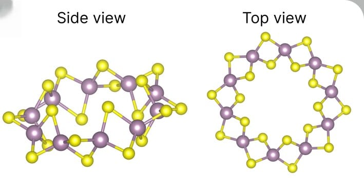 Последняя группа, MonS2n, выделяется удивительными структурными мотивами. Здесь формируются структуры, внешне схожие с тонким слоем сульфида молибдена (MoS₂). Поверхность таких нанокластеров напоминает известный материал графен, обладая похожими электронными свойствами и перспективами применения в микроэлектронике и сенсорных технологиях. Но самое интригующее наблюдение касается метастабильного кольца Mo10S20, которое может оказаться самой маленькой плоской структурой молибдена и серы. Динамическую стабильность такого кольца, а также двумерного слоя из него, ученые подтвердили во время молекулярно-динамического моделирования с обученным ранее межатомным потенциалов MTP.