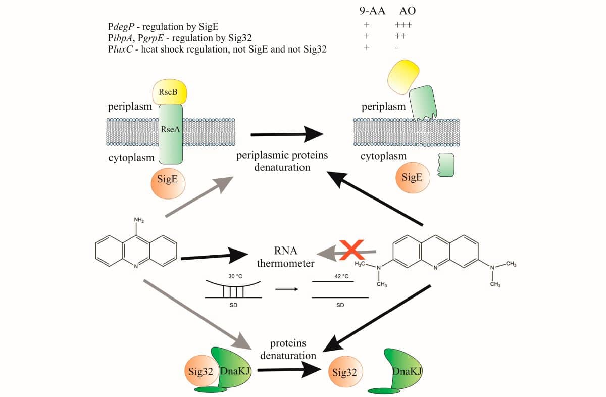 Акридин оранжевый активировал определенные промоторы и защитные механизмы клетки теплового шока, а именно опосредованные белками sigma E и sigma 32. При этом 9-аминоакридин слабее денатурировал белки и «включал» sigma E механизм в меньшей степени, зато активировал промотор PluxC из бактерии Photorhabdus luminescens.