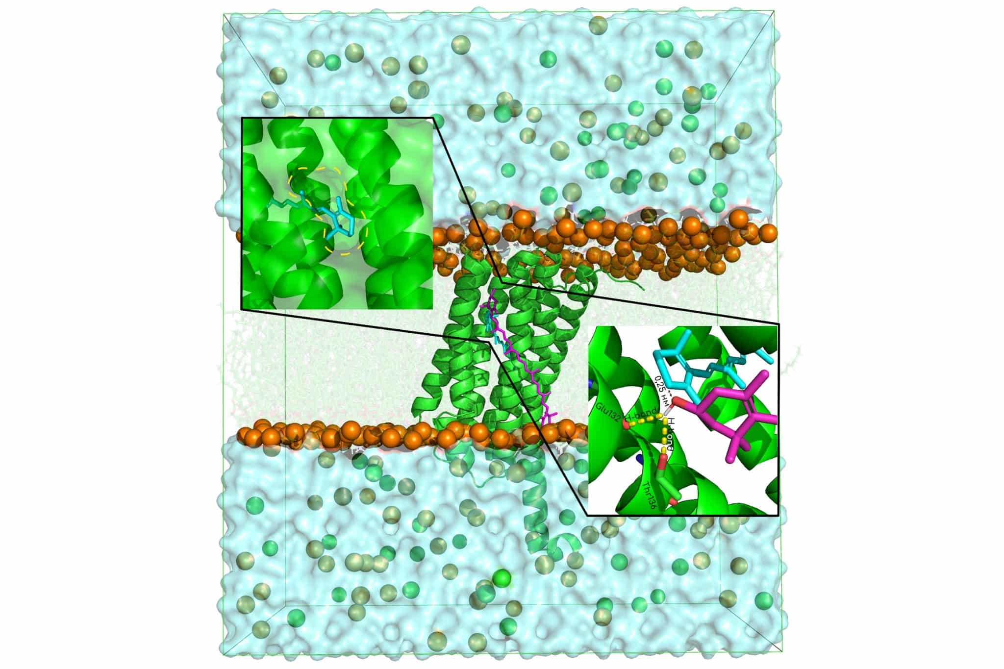 Главным испытанием для модели стала длительная компьютерная симуляция — множество итераций по 1 микросекунде для молекулярно-динамического моделирования в виртуальной клеточной мембране (составленной из липидов, обнаруженных экспериментально в таких бактериях) при температуре, соответствующей антарктическому холоду (+5°C). Расчеты подтвердили, что комплекс не распадается, а сохраняет стабильную архитектуру во времени. Каротиноид прочно удерживается у поверхности белка благодаря двум постоянным водородным связям с производными аминокислот глутамина (Glu132) и треонина (Thr136). Это обеспечивает постоянную сверхмалую дистанцию (всего 0,25 нм) между ретиналем и самым близким атомом каротиноида — условие, необходимое для быстрого и эффективного переноса энергии поглощенного света. Сходимость результатов и устойчивость всей конструкции в ходе симуляции, судя по всему, свидетельствует, что ученым удалось создать адекватную модель реально существующего в природе «светособирающего устройства».