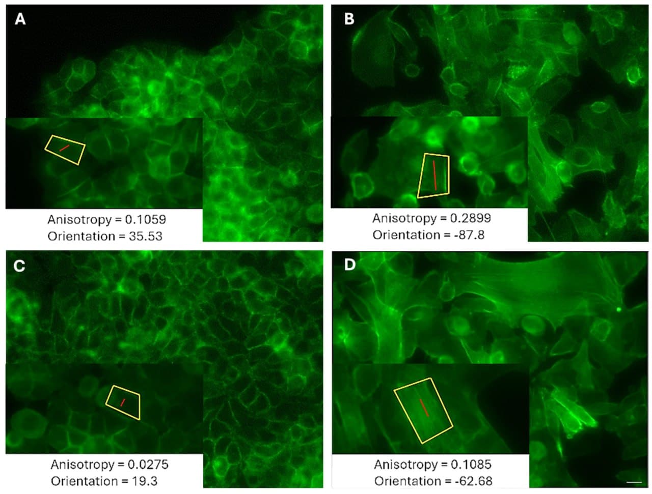 Чтобы понять, как устроен двигательный механизм лидеров ученые решили заглянуть внутрь клеток. С помощью фаллоидина, вещества, которое избирательно связывается с актиновыми нитями, они визуализировали цитоскелет. Анализ изображений показал существенные различия между лидерами и другими клетками сообщества. Актиновые филаменты в лидерах были гораздо более упорядоченными и выстроенными в одном направлении, что отражалось в высоком коэффициенте анизотропии. В то же время клетки с низким двигательным потенциалом демонстрировали хаотичную, беспорядочную структуру актина.