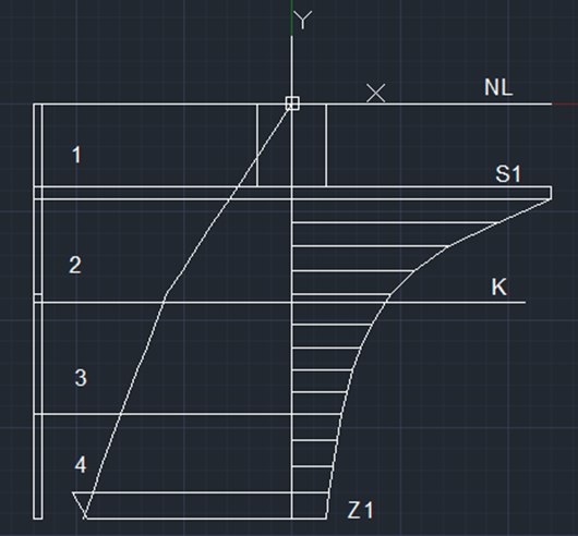 Эскиз расчетной схемы фундамента: NL – граница природного рельефа, S1 – глубина заложения фундамента, K – глубина грунтовых вод, Z1 – нижняя граница сжимаемой толщи, 1–4 – инженерно-геологические элементы / © Пресс-служба ПНИПУ
