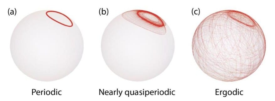 Три режима классической спиновой динамики: (a) периодическая траектория — спин рисует замкнутую кривую на единичной сфере; (b) квазипериодический режим — траектория теряет строгую периодичность, но остается «почти упорядоченной»; (c) эргодический режим — спин покрывает почти всю сферу / © Physical Review E