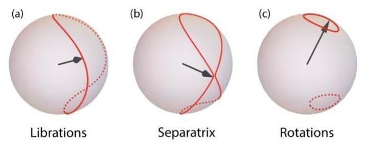 Возможные периодические траектории классического спина при нулевой энергии: (a) либрация — замкнутая кривая на сфере; (b) сепаратриса — критическая граница между режимами; (c) ротация — две разделенные траектории / © Physical Review E