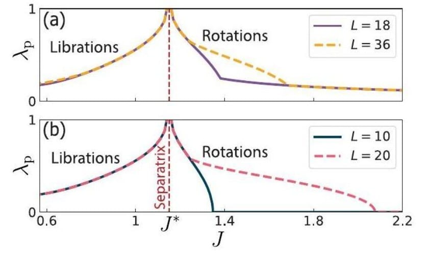 Помимо зависимости от длины, авторы выявили два топологически различных режима периодического движения: «либрации» (колебания, как у маятника, качающегося вблизи нижней точки) и «ротации» (полные обороты, как у маятника, закрученного через верхнюю точку). Переход между ними происходит через сепаратрису — критическую границу в пространстве параметров. Вблизи сепаратрисы ляпуновская экспонента демонстрирует особую каспообразную сингулярность: она резко возрастает, но не расходится, а стремится к конечному значению с бесконечной производной. Авторы вывели аналитическую формулу, описывающую эту сингулярность: зависимость ляпуновской экспоненты от параметра взаимодействия вблизи сепаратрисы оказывается логарифмической.