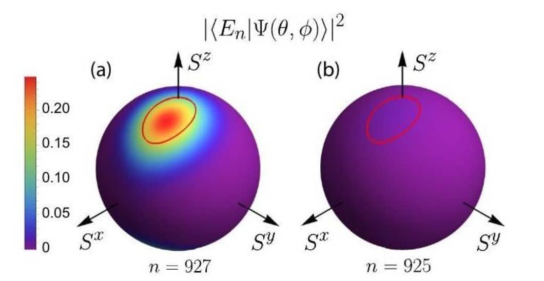 Сферическая карта перекрытия между собственным состоянием энергии и когерентным спиновым состоянием для цепочки спинов 2: (a) шрамовое состояние — плотность концентрируется вдоль периодической траектории; (b) типичное состояние — плотность распределена равномерно / © Physical Review E