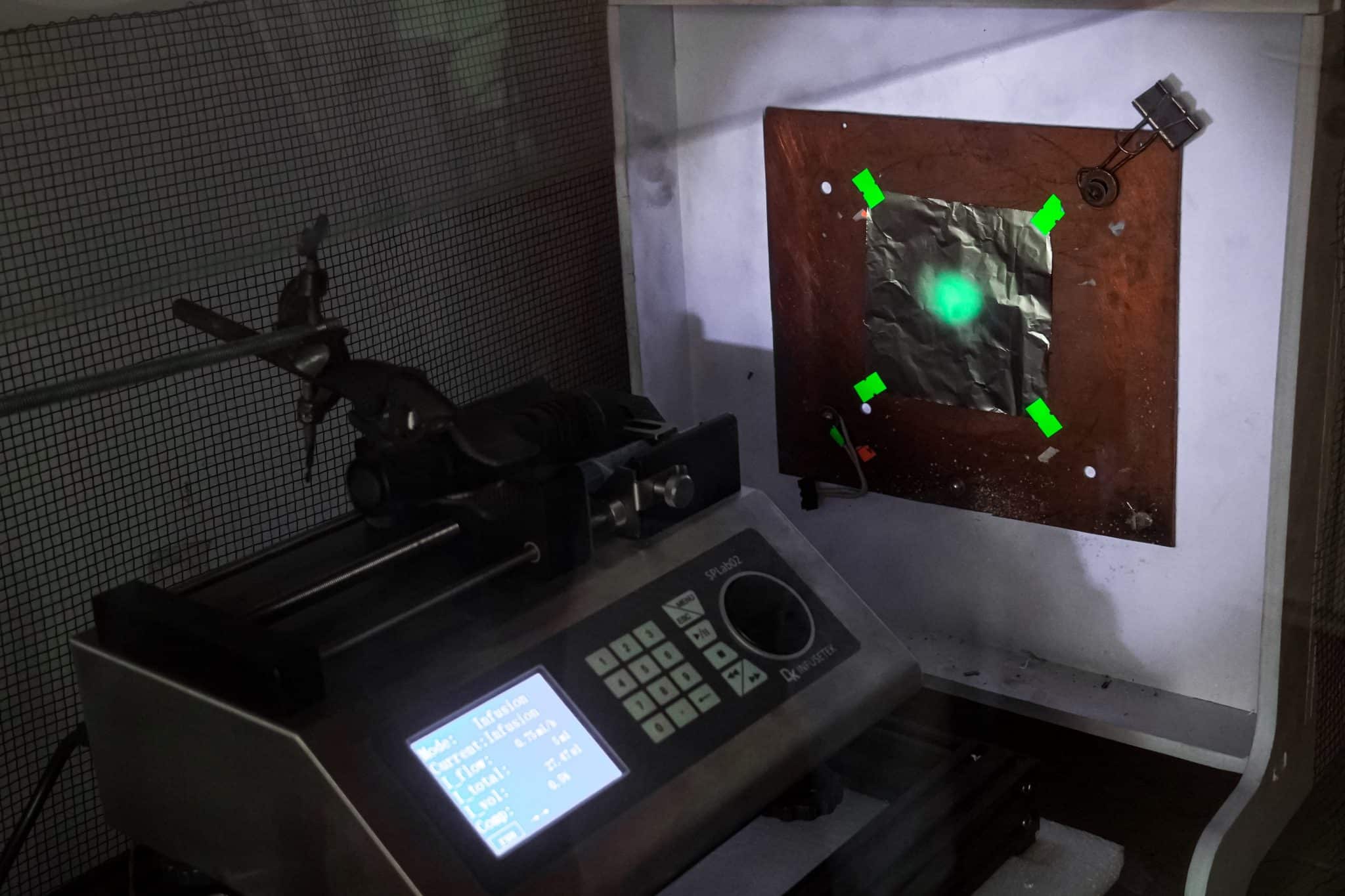 Процесс электроформования и получение люминесцентного нетканого материала в ультрафиолетовом свете / © Дмитрий Ковшов, Саратовский университет