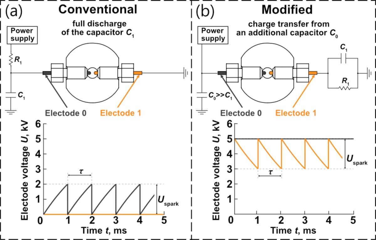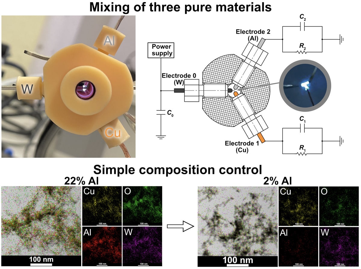 Ключевая инновация заключается в электрической схеме. Вместо того чтобы разряжать один общий конденсатор, система использует большой накопительный конденсатор, который питает две независимые цепи, каждая со своим электродом. Управляя электрическими параметрами — сопротивлением и емкостью — в каждой из этих цепей, исследователи получили возможность ювелирно дозировать энергию, подаваемую на медный и алюминиевый электроды. Это, в свою очередь, позволило им с высочайшей точностью контролировать количество испаряемого металла с каждого из них. Два независимых искровых разряда происходят в непосредственной близости друг от друга, благодаря чему облака металлического пара из разных источников эффективно перемешиваются еще до начала процесса конденсации.