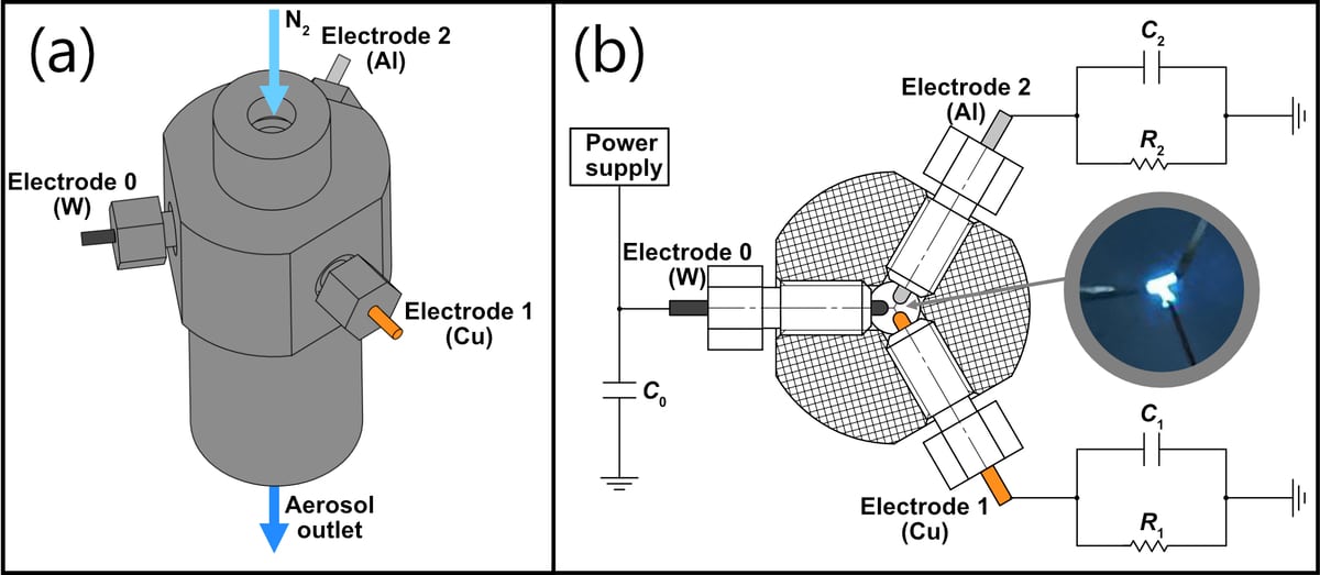В мире нанотехнологий свойства материалов кардинально меняются с уменьшением их размера. Поэтому способность создавать частицы с заранее определенным составом крайне важна. От точного соотношения золота и серебра, меди и вольфрама, или более экзотических комбинаций, зависят каталитическая активность, оптические и электронные свойства, а значит — и эффективность будущих устройств, от сенсоров до элементов памяти. Одним из самых чистых и гибких методов получения наночастиц является искровой разряд, который бьет между двумя электродами, испаряя с их поверхности микроскопическое количество металла. Этот металлический пар затем остывает и конденсируется в потоке инертного газа, образуя наночастицы. Метод не требует использования агрессивных химических реагентов. Однако до недавнего времени у него было существенное ограничение: эффективно и с высокой точностью смешивать можно было лишь два компонента. Попытки ввести третий электрод или использовать электроды из сплавов наталкивались на фундаментальные трудности с контролем итогового состава. Теоретические расчеты часто расходились с практическими результатами, а диапазон получаемых концентраций был узок.