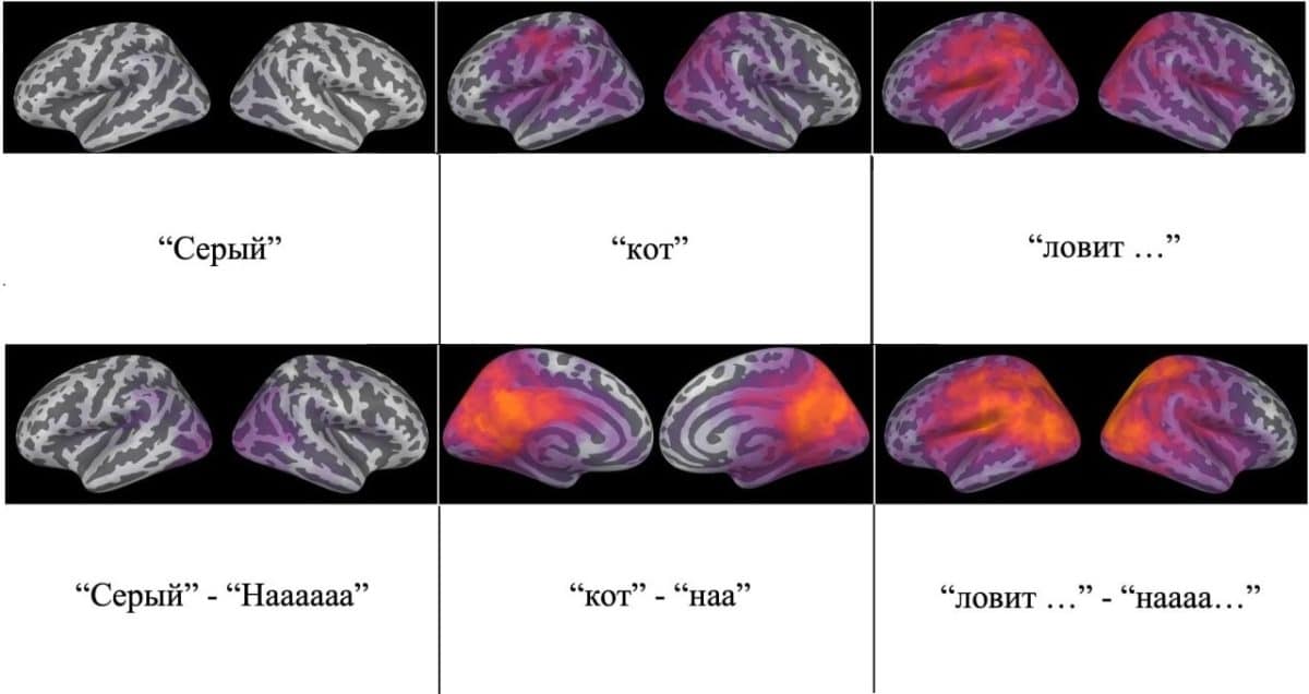 Анализ данных подтвердил, что при выполнении задания активируются классические речевые зоны левого полушария — височные и лобные области, включая участки, отвечающие за понимание и формулировку речи. Активность этих областей нарастала по мере того, как участники продвигались по предложению: сначала включались зоны, связанные с чтением и смыслом, а затем участки, управляющие речевым планированием и артикуляцией.