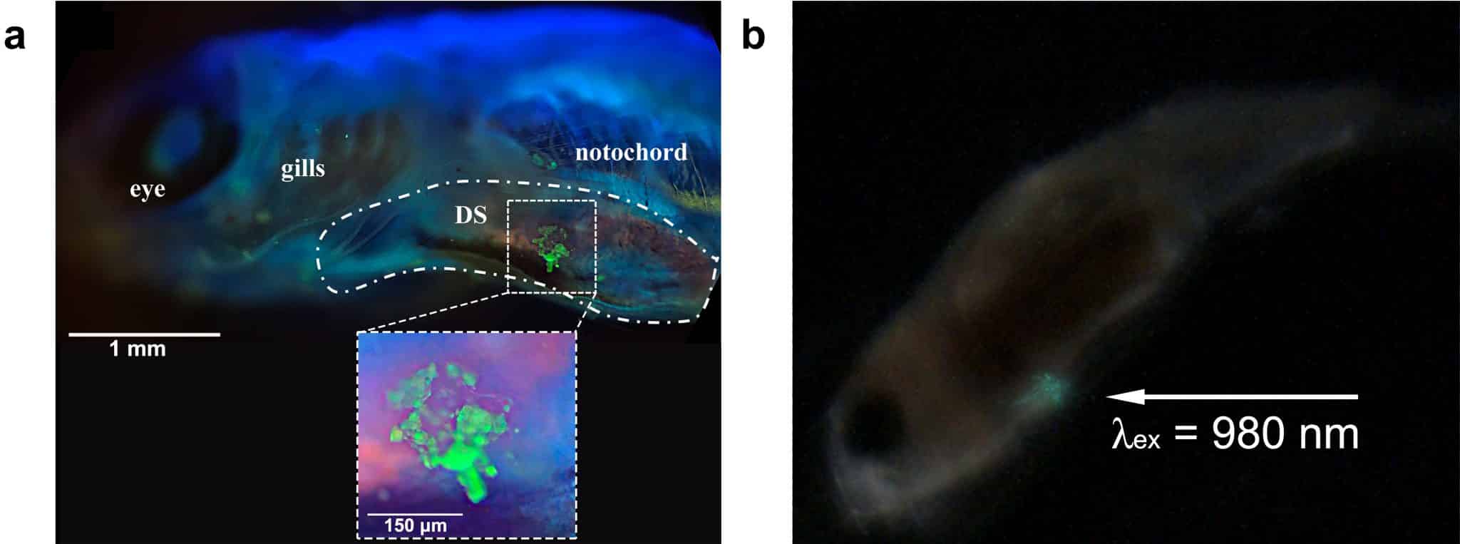 Авторы протестировали новый материал, введя его микрочастицы в желудок часто используемых в экспериментах рыб данио-рерио. Эксперимент показал, что соединение нетоксично для живых организмов и успешно работает в двух режимах. Частицы ярко светились под действием как стандартного инфракрасного излучения с длиной волны 980 нанометров, так и ранее недоступного даже для других материалов диапазона — 1960 нанометров. Последний способен проникать в живые ткани на большую глубину, и благодаря яркому ответному свечению новых наночастиц его удастся использовать для расширенной медицинской диагностики.