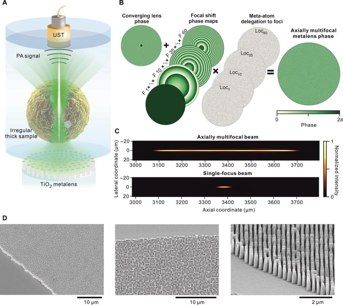 «Каждый элемент массива определенным образом меняет траекторию и фазу излучения, проходящего через металинзу, — прокомментировал Александр Барулин, ведущий научный сотрудник лаборатории контролируемых оптических наноструктур МФТИ, — в результате получается луч, способный сфокусироваться в области шириной порядка двух микрометров и «глубиной» до полумиллиметра. Это в 13,5 раза больше, чем глубина изображения системы из оптических линз, а значит, нам не нужно получать длинную последовательность изображений на разных глубинах биообъекта — всю информацию мы получим за один раз. Кроме того, металинза очень компактна, ведь ее толщина составляет менее микрометра. Это имеет значение, если мы, например, хотим рассматривать создание переносных оптических систем для проведения подобных анализов вне лаборатории».