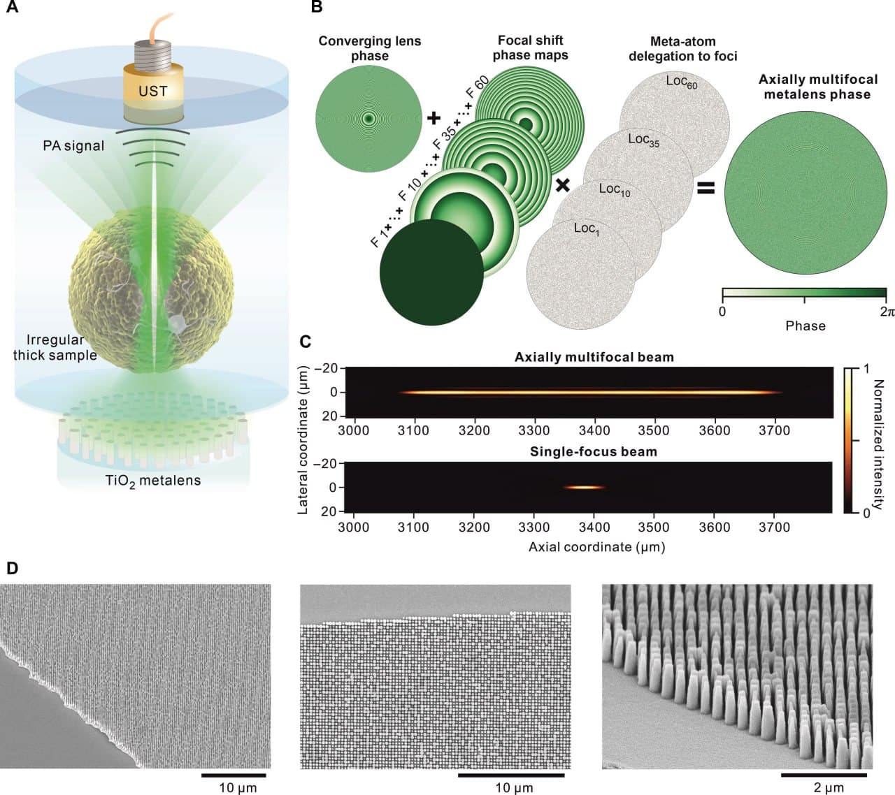 Далее готовую металинзу сравнили с системой из обычных и асферических линз. Фотоакустические изображения трехмерных объектов — наклонного углеродного волокна и фрагмента листа из углеродных волокон, полученные с помощью металинзы, отличались возможностью увидеть детали в более широком диапазоне сканирования.