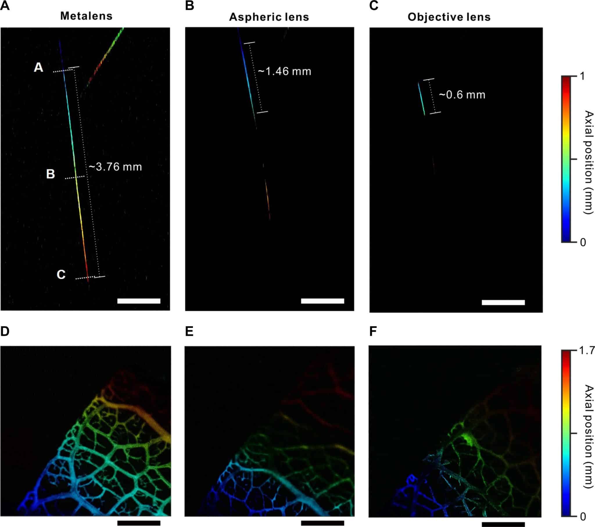 ( A – C ) PA-изображения двух наклоненных в осевом направлении углеродных волокон, закодированные по глубине, полученные с использованием (A) металинзы, (B) асферической линзы и (C) объектива. Буквы, показанные на (A), соответствуют профилям линий, показанным на рис. S13. Указанные значения расстояний соответствуют длине левого волокна, видимого на PA-изображениях. ( D – F ) PA-изображения наклоненного в осевом направлении углеродного листа, закодированные по глубине, полученные с использованием (D) металинзы, (E) асферической линзы и (F) объектива. Масштабная линейка: 500 мкм / © Science Advance