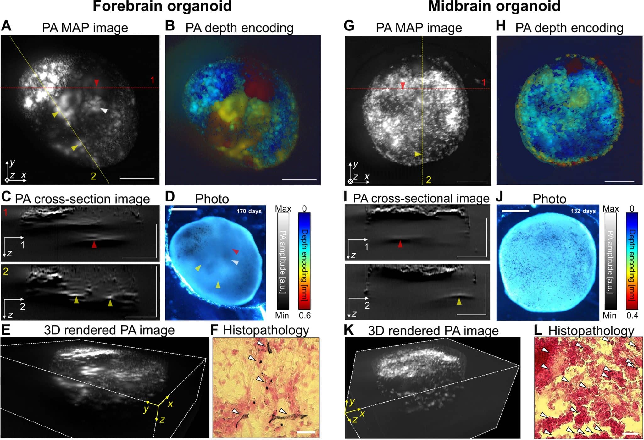 ( A ) PA MAP-изображение органоида переднего мозга, выращиваемого в течение 170 дней. ( B ) PA-изображение органоида переднего мозга с кодировкой глубины, где цвета представляют аксиальное положение нейромеланина. ( C ) PA-изображение поперечного сечения органоида переднего мозга. Верхнее изображение поперечного сечения соответствует красной пунктирной линии на (A). Нижнее PA-изображение поперечного сечения получено вдоль желтой пунктирной линии на (A). ( D ) BF-изображение органоида переднего мозга. Четыре стрелки на (A) и (D) указывают на одно и то же место. ( E ) 3D-рендеринг PA-изображения органоида переднего мозга. ( F ) Окрашивание органоида переднего мозга по Фонтана-Массону. Стрелки указывают на черные пигменты в органоиде переднего мозга. ( G ) PA MAP-изображение органоида среднего мозга, выращиваемого в течение 132 дней. ( H ) Кодированное по глубине PA-изображение органоида среднего мозга с цветами, представляющими аксиальное положение нейромеланина. ( I ) PA-изображение поперечного сечения. Верхнее изображение поперечного сечения соответствует красной пунктирной линии на (A). Нижнее PA-изображение поперечного сечения получено вдоль желтой пунктирной линии на (A). ( J ) BF-изображение органоида среднего мозга. ( K ) 3D-рендеринг PA-изображения органоида среднего мозга. ( L ) Окрашивание органоида среднего мозга по Фонтана-Массону. Стрелки указывают на черные пигменты в органоиде среднего мозга. Масштабная линейка: 500 мкм. au, условные единицы / © Science Advances
