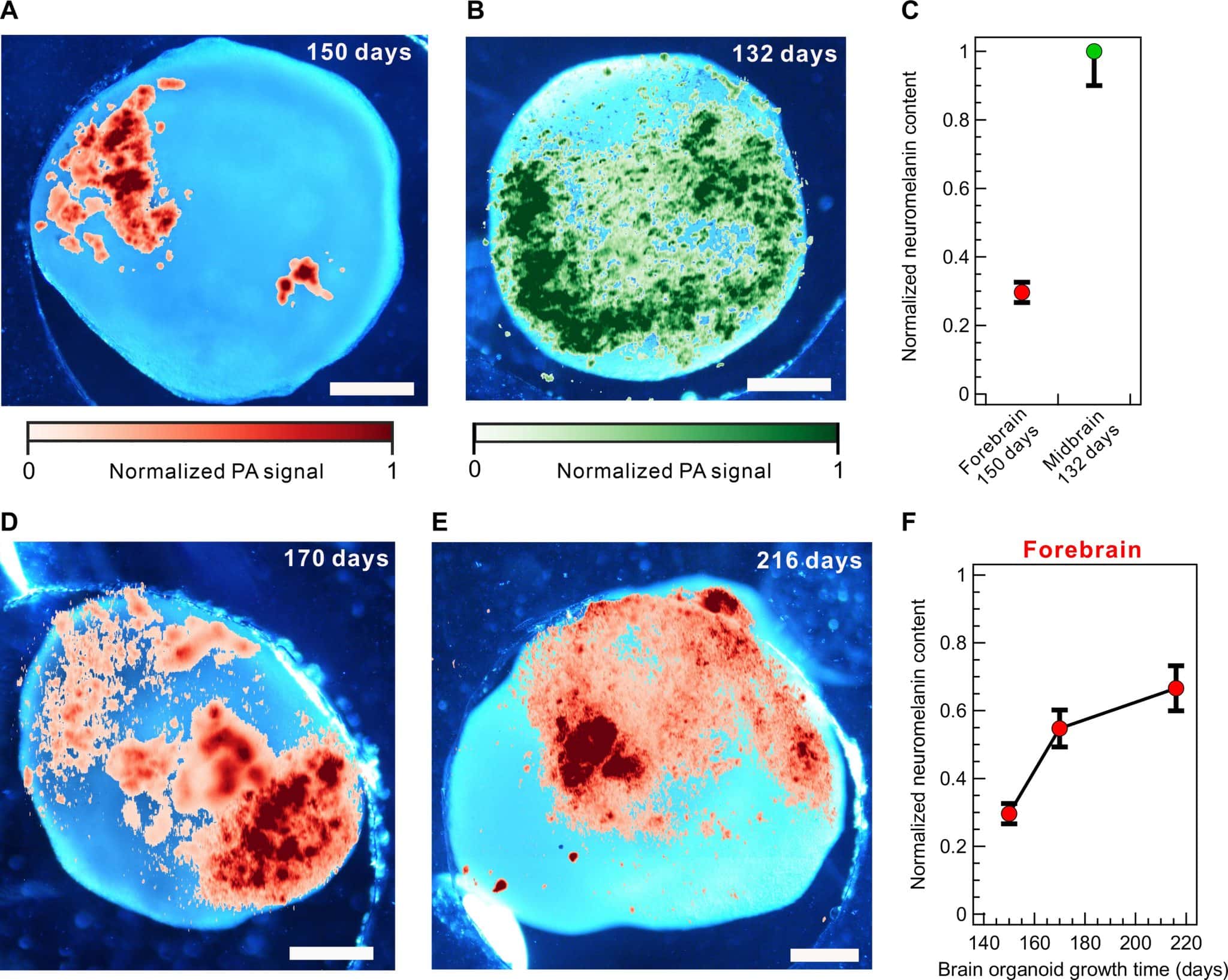( A ) Наложенные изображения BF и PA органоида переднего мозга на 150-й день. ( B ) Наложенные изображения BF и PA органоидов среднего мозга на 132-й день. ( C ) Нормализованное содержание нейромеланина в органоидах мозга из (A) и (B). Содержание нейромеланина оценивается путем суммирования пикселей изображения PA, показывающих сигналы выше фонового шума, с высокой точностью. Планки погрешностей соответствуют вариациям содержания нейромеланина, вызванным снижением порогового значения в пределах стандартного отклонения фонового шума. ( D и E ) Наложенные изображения BF и PA органоидов переднего мозга на 170-й и 216-й день соответственно. ( F ) Нормализованное содержание нейромеланина в органоидах мозга из (A), (D) и (E). Масштабная линейка: 500 мкм / © Science Advance