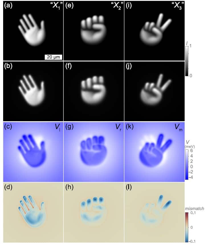 Чтобы продемонстрировать возможности своей платформы, исследователи провели численное моделирование, поставив перед алгоритмом топологической оптимизации амбициозную задачу. В качестве целевых изображений исследователи выбрали три сложных узора, сгенерированных нейросетью: раскрытая ладонь, сжатый кулак и рука, которая показывает знак победы (V). Алгоритм успешно рассчитал необходимую наноразмерную модуляцию толщины экситонных слоев. Моделирование показало, что при одном значении управляющего параметра (угла наклона молекул жидкого кристалла) поляритонный конденсат действительно принимает форму ладони, при другом — кулака, а при третьем — знака V.
