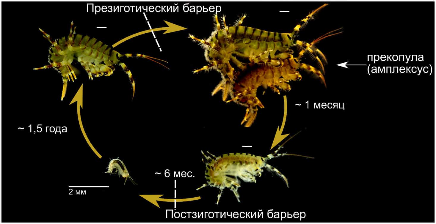 Оказалось, при наличии выбора животные в абсолютном большинстве случаев предпочитают представителей собственного вида, а вот если выбора не предоставить, то довольствуются тем, что есть, и пытаются спариться с «неподходящими» партнерами. При этом, если оплодотворение в гибридных скрещиваниях и происходило, то развитие зародышей останавливалось. Эта остановка происходила на стадии, когда развитие перестает зависеть от запасов материнского организма, и в работу должен включаться геном рачка-детеныша. Таким образом, за несколько миллионов лет независимой эволюции виды бородавчатых эулимногаммарусов накопили различия, больше не позволяющие им скрещиваться.