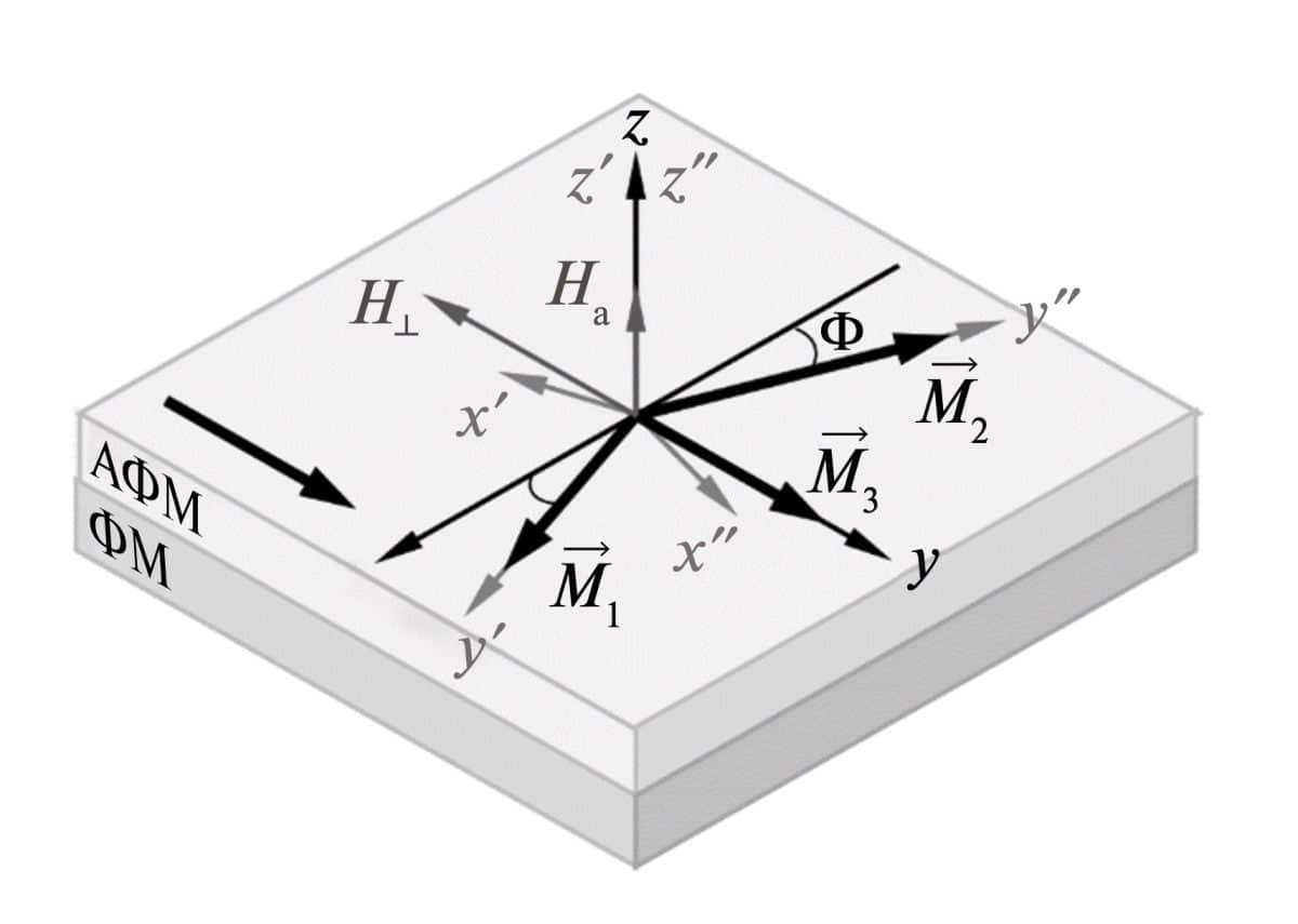 В этом исследовании авторы впервые теоретически исследовали двухслойную структуру, состоящую из скошенного антиферромагнетика и ферромагнетика. Новизна работы заключается в использовании скошенного антиферромагнетика, это антиферромагнетик со слабым ферромагнетизмом, где подрешетки намагниченности слегка отклонены от антипараллельной ориентации. Подобных исследований ранее не проводилось. Скошенные антиферромагнетики представляют особый интерес, поскольку из-за своей структуры имеют две резонансные моды: нижняя (в десятках гигагерц) удобна для экспериментов, в отличие от верхней (в сотнях гигагерц). Статья опубликована в журнале «Радиотехника и электроника».