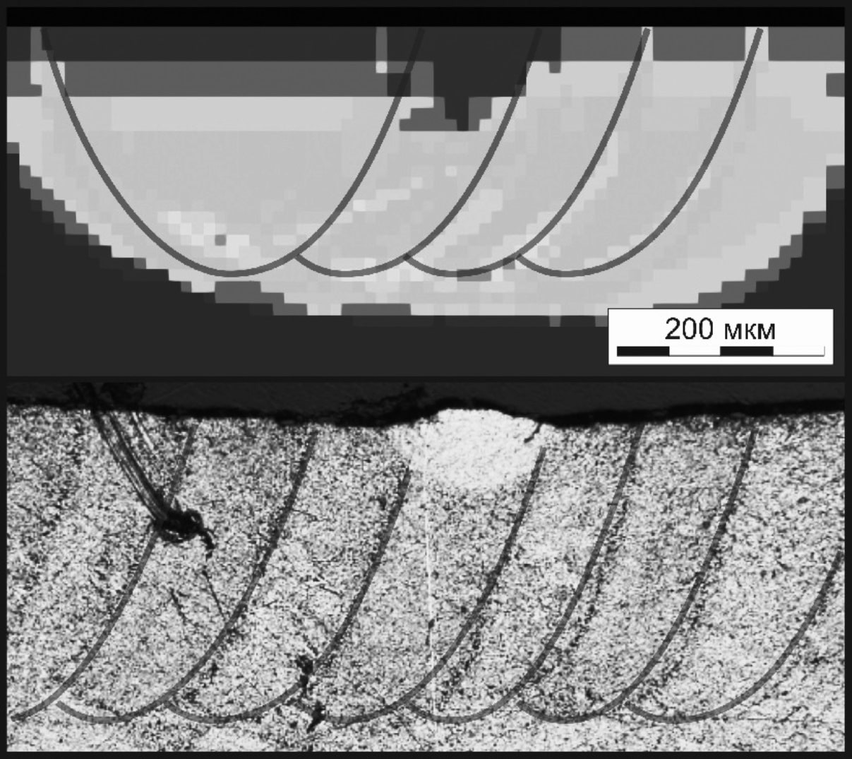Чтобы проверить точность модели, ученые изготовили алюминиевый образец методом селективного лазерного плавления и рассмотрели его под оптическим микроскопом. После чего они смоделировали структуру образца при этих же условиях получения. В ходе сопоставления расчетных и опытных данных было установлено их соответствие (рисунок 2).