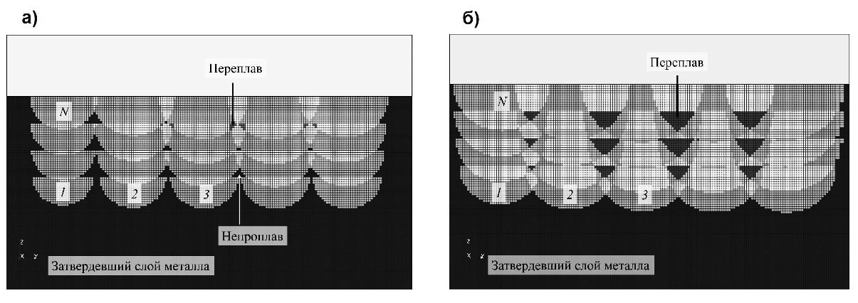 Моделирование структурных дефектов титанового сплава показало, что при высокой скорости лазерного луча остаются участки с нерасплавленным порошком. С замедлением движения лазера, наоборот, появляются области переплавления материала. Многократный переход вещества из жидкого состояния в твердое вызывают процессы формирования соседних слоев. Следовательно, в зависимости от режима селективного лазерного плавления образуется материал с непроплавленными либо переплавленными участками, расположенными послойно (рисунок 3). Такие локальные дефекты занимают до 30–40% от линейного размера слоя.