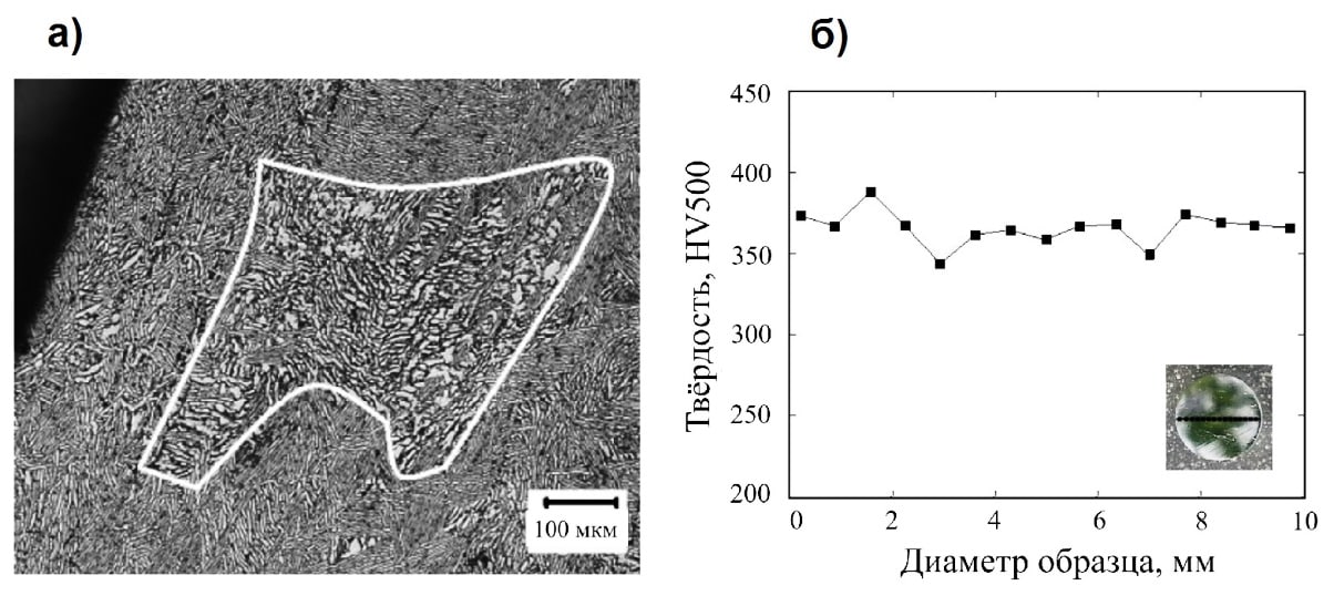 В переплавах, благодаря длительному тепловому воздействию, образуются крупные зерна с иным фазовым составом (рисунок 5). Их появление увеличивает микротвердость и модуль упругости переплавов на 10–15% по сравнению с бездефектными областями.