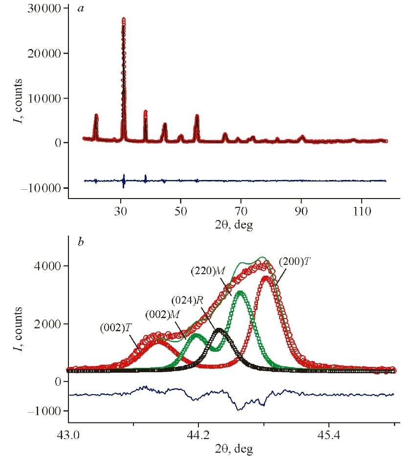 Введение же даже небольшого количества легирующих добавок, как в образцах ЦТС-19 и ЦТС-23, коренным образом меняло картину. В них ромбоэдрическая фаза исчезала полностью, и материал представлял собой смесь только двух фаз — тетрагональной и моноклинной. При этом соотношение этих двух фаз оказалось критически важным. Например, в керамике ЦТС-19, показавшей наилучшие пьезоэлектрические характеристики, массовые доли тетрагональной и моноклинной фаз оказались почти равными (49% и 51% соответственно). В то же время в керамике ЦТС-23 доминировала тетрагональная фаза (72%), что коррелировало с иными электрофизическими параметрами.