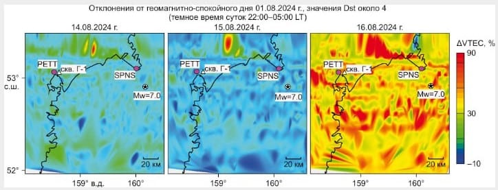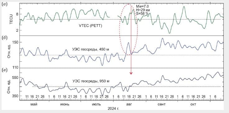 Ученые уточнили физический механизм формирования крупных неоднородностей в ионосфере на заключительных стадиях подготовки сильных землетрясений. Было показано, что в значительной мере появление аномалий в ионосфере перед сильными землетрясениями связано с изменениями удельного электрического сопротивления геосреды верхней части земной коры на заключительных стадиях подготовки землетрясения.